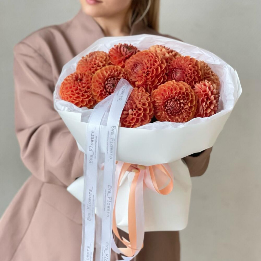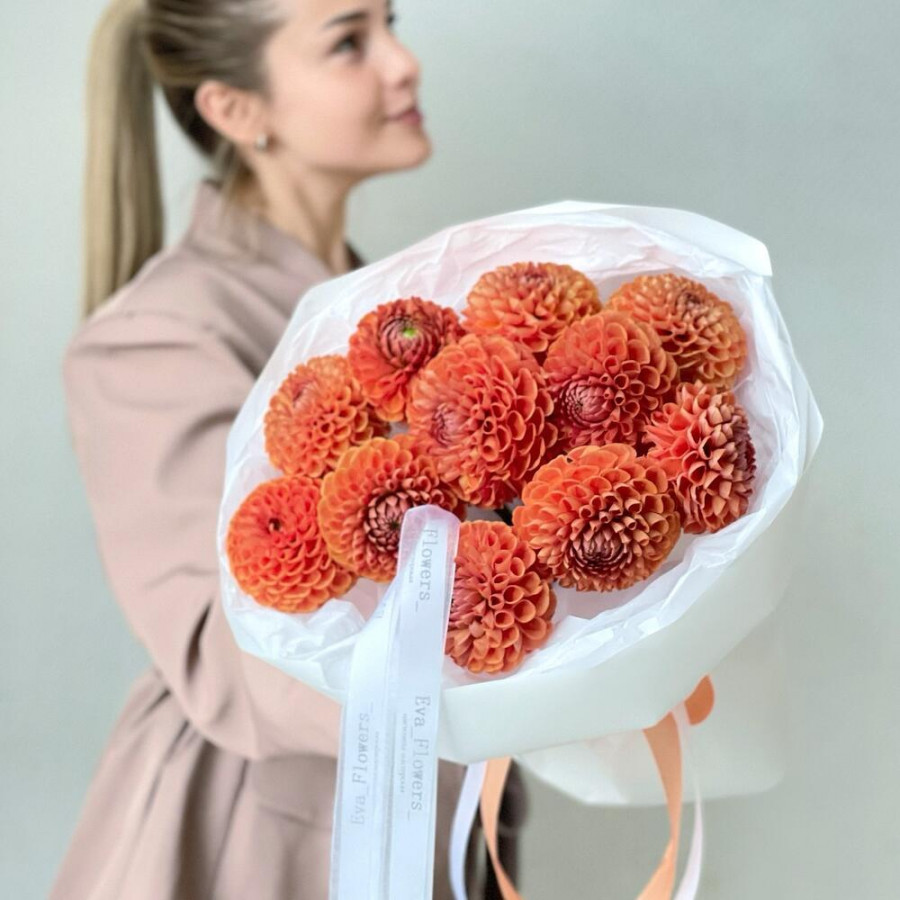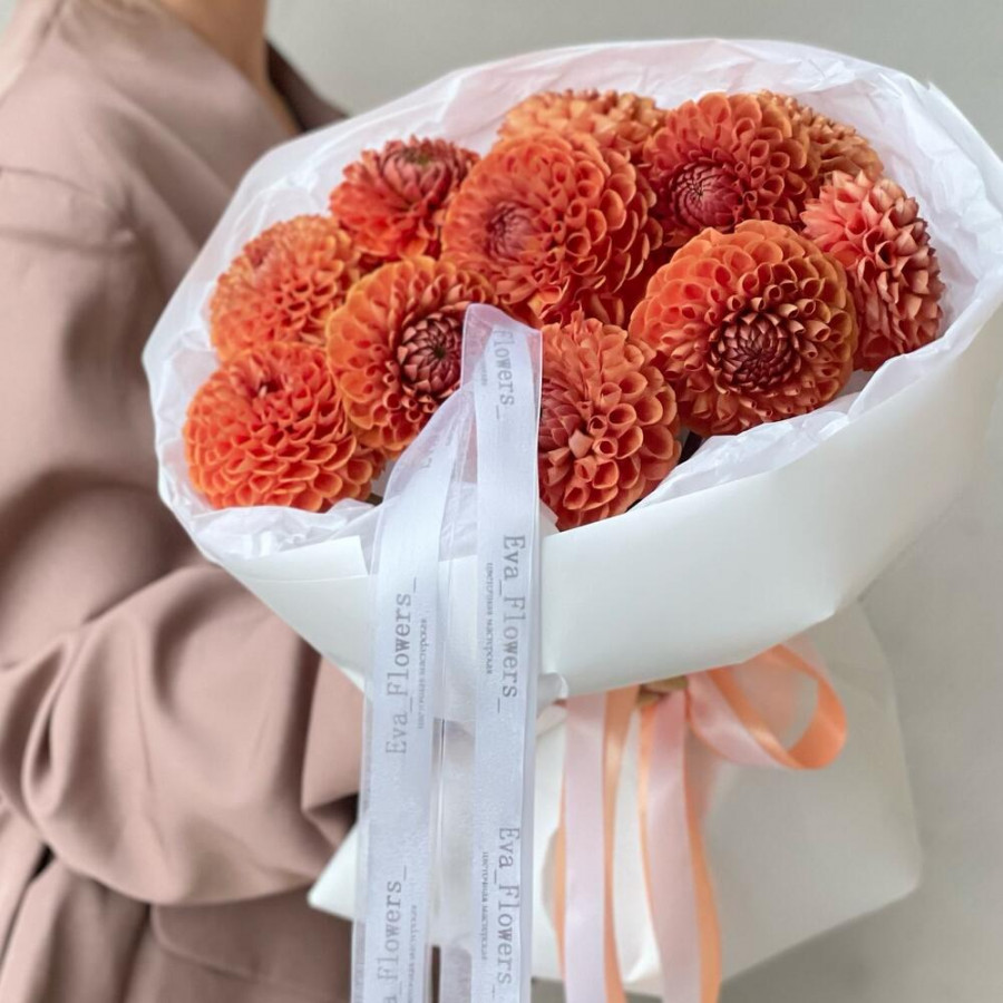 На фото букет из 11 оранжевых георгин. В составе: георгина 11 шт, дизайнерская упаковка 2 шт, атласная лента 2 шт, . Все цветы свежие и ароматные, букет красиво оформлен и отлично подходит для подарка. Доступна доставка цветов или самовывоз.