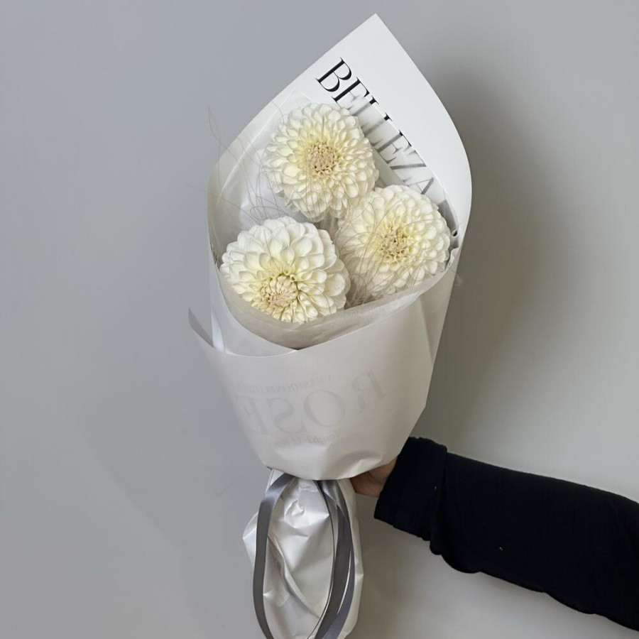 На фото букет из 3 белых георгин. В составе: георгина 3 шт, сухоцветы (микс) 2 шт, дизайнерская упаковка 1 шт, атласная лента 1 шт, . Все цветы свежие и ароматные, букет красиво оформлен и отлично подходит для подарка. Доступна доставка цветов или самовывоз.