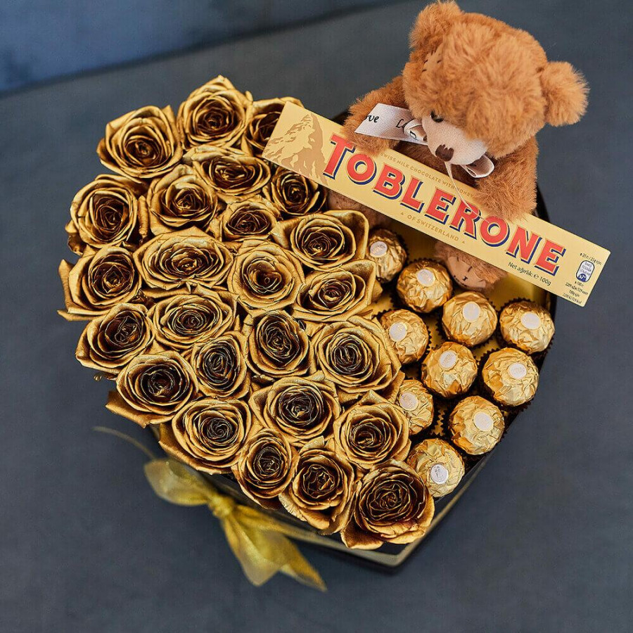 Букет из 31 золотой розы с конфетами в Бору