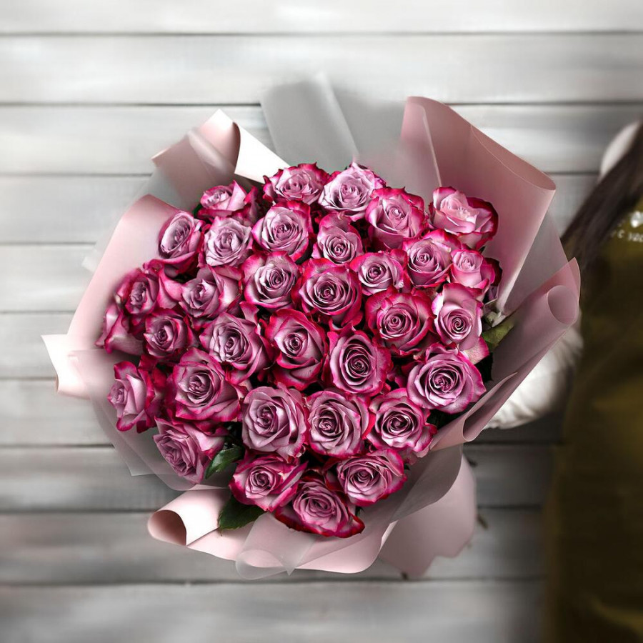 На фото букет из 33 фиолетовых роз. В составе: роза 33 шт, дизайнерская упаковка 1 шт, атласная лента 1 шт, . Все цветы свежие и ароматные, букет красиво оформлен и отлично подходит для подарка. Доступна доставка цветов или самовывоз.