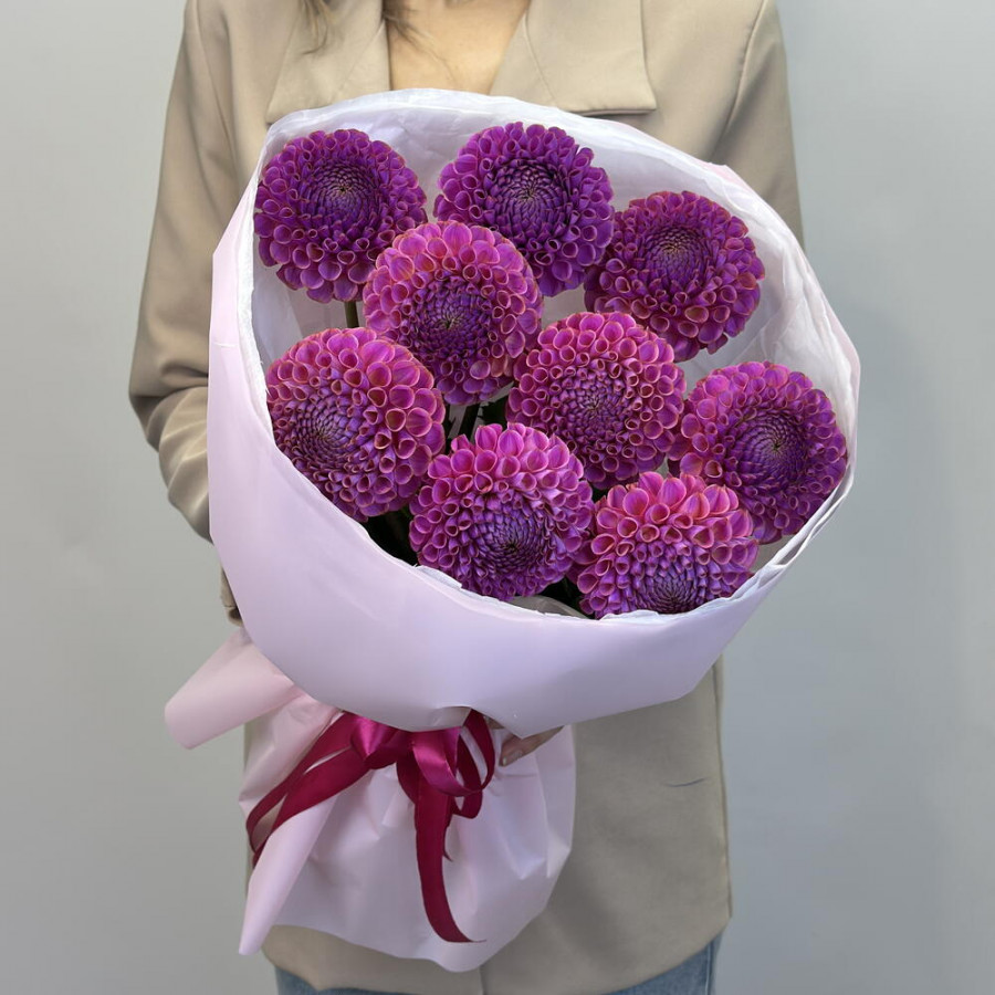 На фото букет из 9 фиолетовых георгин. В составе: георгина 9 шт, дизайнерская упаковка 1 шт, атласная лента 1 шт, . Все цветы свежие и ароматные, букет красиво оформлен и отлично подходит для подарка. Доступна доставка цветов или самовывоз.