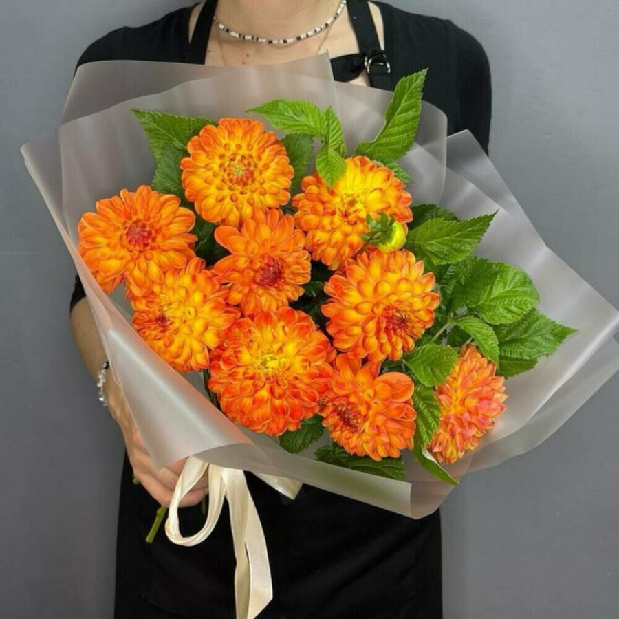 На фото букет из 9 оранжевых георгин. В составе: георгина 9 шт, зелень 3 шт, дизайнерская упаковка 1 шт, атласная лента 1 шт, . Все цветы свежие и ароматные, букет красиво оформлен и отлично подходит для подарка. Доступна доставка цветов или самовывоз.
