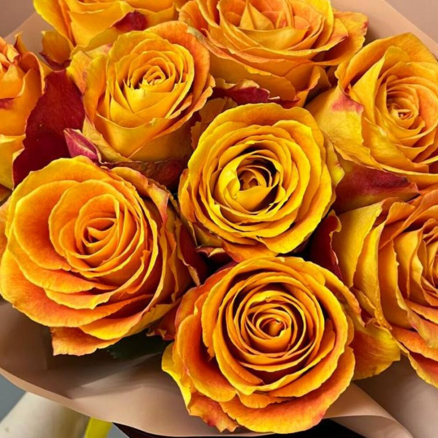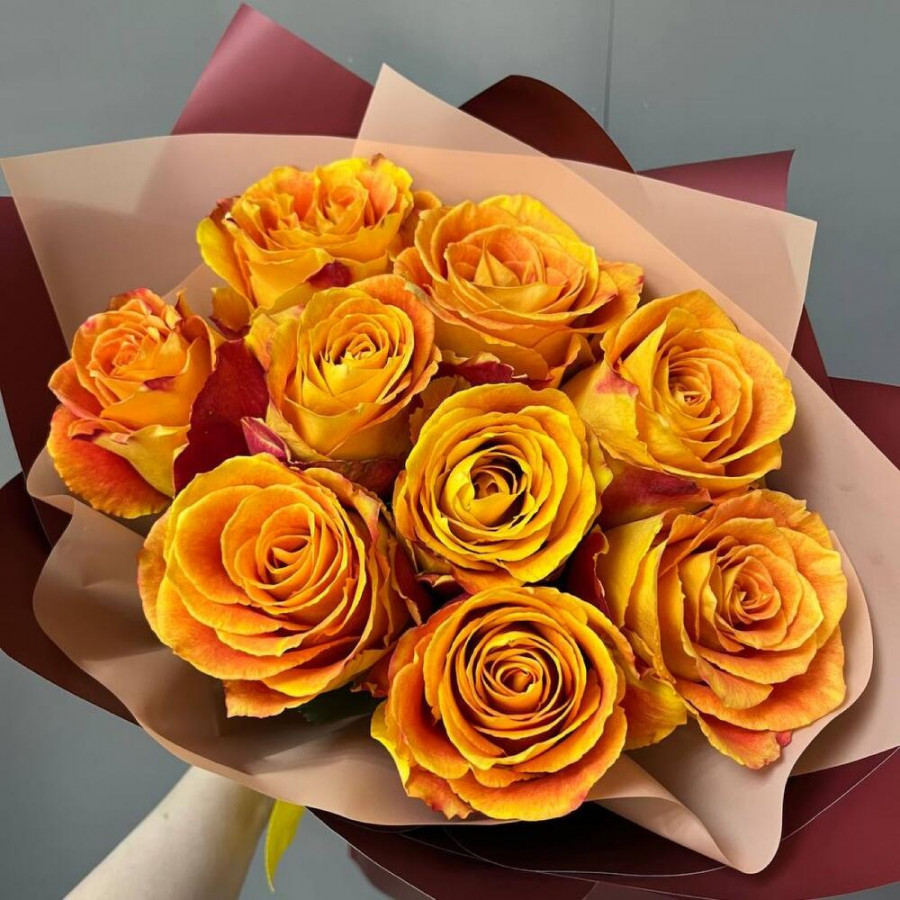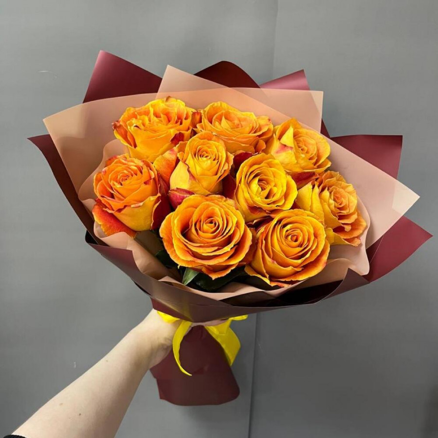 На фото букет из 9 оранжевых роз. В составе: роза 9 шт, дизайнерская упаковка 2 шт, атласная лента 1 шт, . Все цветы свежие и ароматные, букет красиво оформлен и отлично подходит для подарка. Доступна доставка цветов или самовывоз.